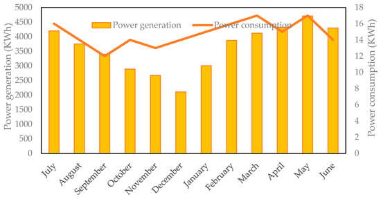 A solar power system with a capacity of 30 kW, comprising 120 solar panels, was successfully installed on the rooftop of the UET building in 2019. Figure 5 shows the real-time monthly power generation of the building. On average, the building generated approximately 3612 kWh of power per month. Notably, the peak power production was achieved in May, reaching a maximum of 4710 kWh per month. Subsequently, this production gradually diminished, reaching its lowest point of 2110 kWh per month in December. However, the average monthly power consumption is approximately 14.75 KWh. The maximum power consumption was observed in May due to the summer season, while the minimum power consumption was observed in December due to winter and vacation. The envisaged UETWPP unit is designed to operate between 8 a.m. and 4 p.m., exclusively on working days. This operational schedule ensures a consistent pattern of power consumption throughout the year, promoting stability in the system’s energy usage.
