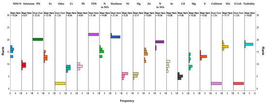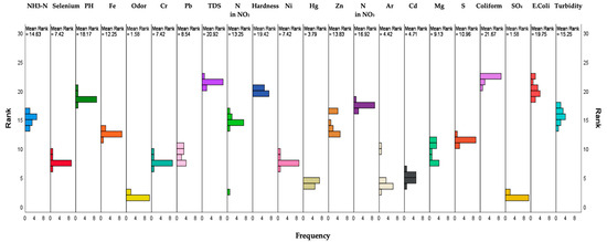 Figure 6 illustrates the outcome of Friedman’s descriptive analysis. Each component is denoted by a point on the graph, with its mean value positioned along the horizontal axis and its corresponding rank along the vertical axis. The ranking is established based on mean values, attributing lower ranks to components with higher mean values and vice versa. Effectively, the graph provides insight into how the components relate to one another in terms of mean values and ranks. Higher mean values and lower ranks signify components with greater significance or influence, while those with lower mean values and higher ranks have relatively lower importance. Coliform has the highest mean value (Figure 6), which shows a greater influence on rainwater quality.