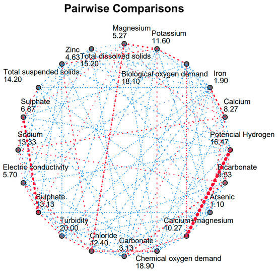 In the context of untreated rainwater, the analysis presented in Figure 8 involves a pairwise comparison of its components. This comparison aims to assess the significance of the relationships between different components. The results are visually represented using lines on the graph. Components that exhibit a significant relationship with each other are denoted by a blue line, indicating their strong correlation. Conversely, components that lack a significant relationship are represented by a red line, suggesting the absence of a meaningful connection between these variables.