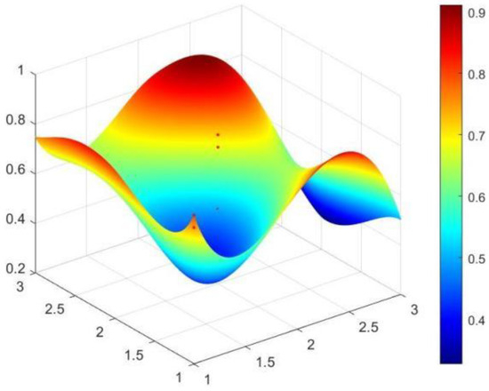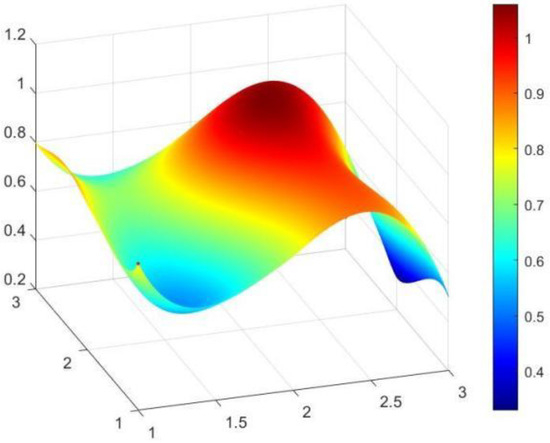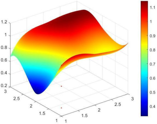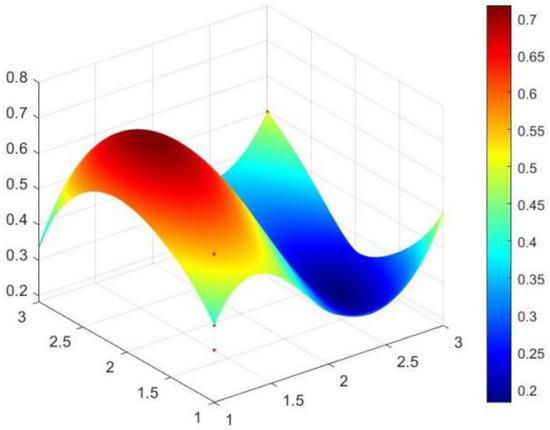 The PMC surface figure is a symmetric surface based on the values of nine first-level indexes, which can show the pros and disadvantages of various policies, so as to better evaluate carbon reduction policies formulated by the Chinese government. Since the values of policy disclosure (Z10) of 12 carbon reduction policies are all 1, the policy disclosure index variables are eliminated, and a 3 × 3 matrix is constructed according to the values of the remaining indicators (see Formula (5)). Since the 12 policies are divided into four different grades, this paper selects one representative policy for each grade of perfect (A2), excellent (A1), good (A9), and badness(A12), and then, this paper uses Matlab 2022 software to draw three-dimensional surface figures of four representative policies of different grades (see Figure 2, Figure 3, Figure 4 and Figure 5).