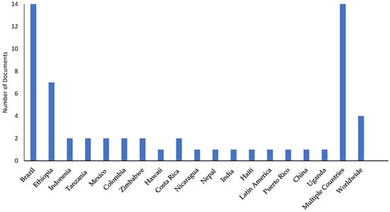 From another side, Figure 4 depicts the literature published on coffee production in different countries, most of which relate to Brazil (n = 14). The research on the coffee crop in Ethiopia is reported in seven documents, whereas we obtained a similar number of documents (n = 2) for Indonesia, Tanzania, Mexico, Colombia, Zimbabwe, and Costa Rica. Some articles combined studies including many countries (n = 14), and a few (n = 4) analysed climate-related aspects of coffee crops worldwide.