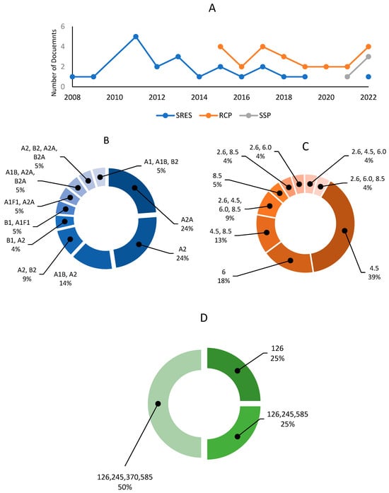 The available literature has been more consolidated over the last decade. Therefore, the RCP are more prevalent than the SRES scenarios, commonly used by the literature in the earlier years (2008–2019), and were gradually, but not entirely, replaced by the RCP scenarios between 2015 and 2022. In the review results, the RCP scenarios prevail (23 papers), followed by the SRES (21 manuscripts) and the SSP (4 studies) (Figure 6A). The use and frequency of different scenarios across the results indicate that the highest number of papers (n = 7) adopted RCP 4.5 and RCP 8.5, followed by RCP 4.5, SRES A2A, SRES A2, and SRES A2 (n = 5 for each scenario). The other scenarios found in the literature (RCP (2.6, 4.5, 6.0 and 8.5), SRES (A2 and B2), and SSP (126, 245, 370 and 585)) are adopted in two research papers each (Figure 6B). The remaining scenarios were used only once in the literature, including RCP (2.6 and 8.5), (2.6 and 6.0), (2.6, 4.5 and 6.0), (2.6, 6.0 and 8.5), SRES (B1 and A2), (B1, and A1F1), (A2A, and A1F1), (A1B, A2A and B2A), (A2, B2, A2A and B2A), (A1, A1B and B2), and SSP (126, 245 and 585) (Figure 6C,D).