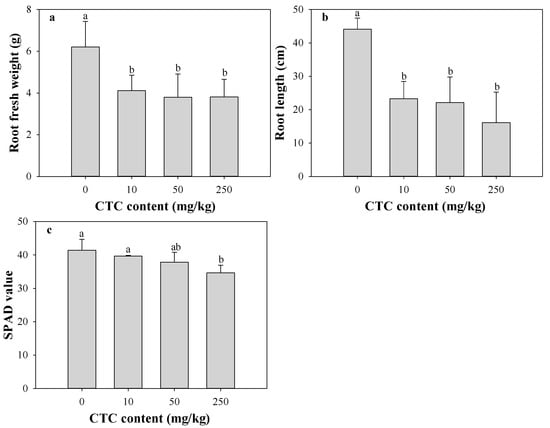 In this study, the growth of eggplant was inhibited by CTC-contaminated soil. As illustrated in Figure 1, the root fresh weight, root length and SPAD value in the CTC treatment groups demonstrated a concentration-dependent decrease with an increase in CTC dosage. Root fresh weight, root length, and SPAD value were all significantly (p < 0.05) decreased with the highest CTC treatment (250 mg/kg), by 38.58%, 63.49%, and 16.35%, respectively.