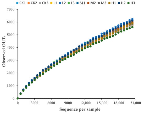 High-throughput sequencing of the 16S rRNA gene amplicons convincingly demonstrated the alterations in the soil microbiota in response to the chronic CTC exposure. A total of 254,556 sequences were obtained from all samples. The sequences’ rarefaction curves (Figure 2) revealed that enough sampling coverage was achieved for the soil samples.