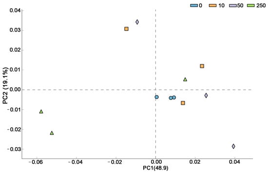 Figure 3 demonstrated that principal component (PC) 1 and 2 explained 68% of the total variance, with PC1 contributing 48.9%, showing that the first principal component was primarily responsible for the variations in microbes between control and CTC-treated soil. The PCA plot revealed that whereas soil samples from the CTC-treated groups displayed a more dispersed distribution, indicating some degree of variance, samples from the control group tended to be closely clustered, indicating a generally similar community makeup. The PCA plot in Figure 3 demonstrated that soil samples from several groups had a large difference in distribution distance, indicating that each group’s microbial community composition varied greatly.