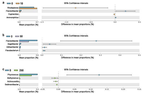 The chronic CTC exposure significantly (p < 0.05) altered the relative abundance of 11 genera (Figure 5). Rhodoplanes and Cupriavidus were enriched in 10 mg/kg CTC group indicating they may prefer low-dose CTC. Methylosinus, Actinocorallia, and Sedimentibacter were enriched in 250 mg/kg CTC group, indicating that high-dose CTC stimulated the growth of these genera. Compared with the control, the relative abundances of Flavisolibacter and Ammoniphilus were significantly reduced by 10 mg/kg CTC. The relative abundances of Flavisolibacter, Segetibacter, Adhaeribacter, and Flavobacterium were significantly reduced by 50 mg/kg CTC. A total of 250 mg/kg CTC significantly inhibited the growth of Phycicoccus.
