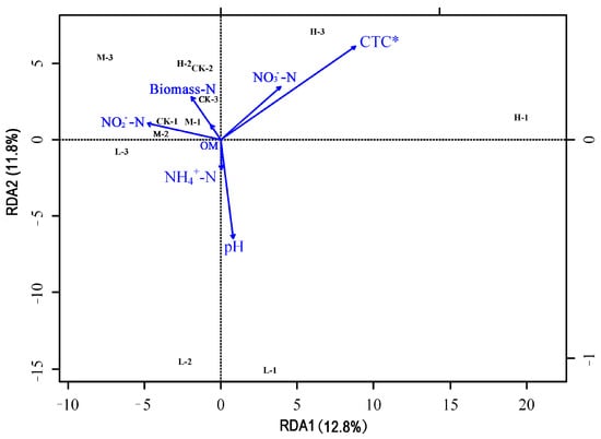 Previous studies have demonstrated that NH4+–N and NO3−–N were the main forms of nitrogen absorbed and utilized by plants, and their content can influence plant growth and effectively indicate the nitrogen supply in soil []. In this study, the significant reduction in NH4+–N and NO2−–N by CTC may be related to the decline of azotification and nitrite bacteria activity. As a measure of soil nitrification capability, NO3−–N concentration is much more sensitive to the presence of pharmaceuticals []. And due to high sensitivity of NO3−–N, all CTC groups showed lower nitrate nitrogen NO3−–N levels. The inhibitory effects of CTC on soil nitrification capacity, which may be brought on by the inhibitory effects on nitrobacteria, are similar to previous studies on effects of pharmaceutical antibiotics on nitrification capacity [,,].