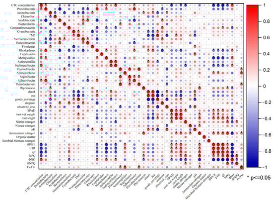 To examine the interrelationships among different indexes, the correlation analysis (Pearson) was carried out in this study (Figure 7). The red and blue circles represented the positive and negative correlation between the two related indexes, respectively. And the size of the circles represented the absolute value of the correlation coefficient. As shown in Figure 7, there was some degree of correlation between CTC, soil characteristics, plant growth, fluorescence parameters, and soil bacteria, demonstrating that these variables were closely correlated. Root length had significant negative correlation with ΦNO, positive correlation with ETR, qP, NPQ, ΦPSII and NH4+–N. In this study, Rhodoplanes demonstrated a positive correlation with Methylosinus and Adhaeribacter. Actinocorallia and Sedimentibacter exhibited a positive correlation. Flavobacterium exhibited a positive correlation with Flavisolibacter and Segetibacter.