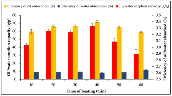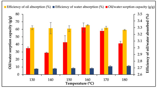 3.3. Optimisation of Factors for Oil/Water Sorption Capacity Using OFAT