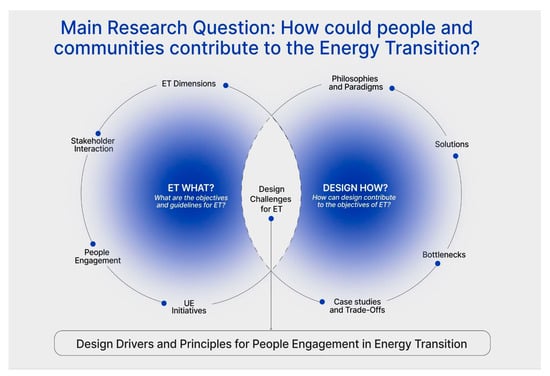 The research is based on an extensive and multidisciplinary literature review and case study analysis; as shown in the Visual Abstract in Figure 1, the article is structured into two main sections corresponding to the two research questions. The first one examines ET, drawing upon European Union official documents and academic literature to outline its values, objectives, actors, initiatives, and challenges, with specific attention given to the role of citizens and communities. The second section explores the contributions of design as a discipline and practice, summarizing design theories, philosophies, solutions, and paradigms aligned with the goals and challenges for ET. Critical issues such as barriers and obstacles to behavioural changes and people engagement in ET are also discussed.