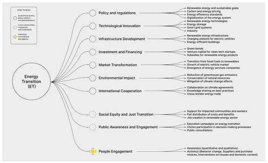 Figure 2 represents various dimensions of the ET, categorized into three levels according to the engaged actors: (i) individual commitment and agency; (ii) local communities; and (iii) companies and institutions, economic actors, policymakers, and institutions. The figure captures the multifaceted nature of the ET by showcasing various elements within each level and their relationships.