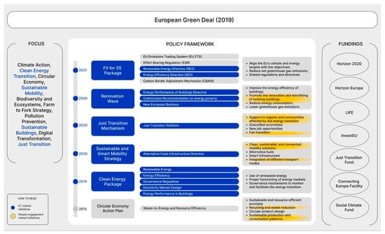 The first section (Focus) aims to establish a link between the sustainable transition goals and the main EU initiative. The Policy Framework section breaks down the main plan of the European Green Deal into priorities that directly or indirectly address one or more focuses of the ET. Focus areas and packages specifically directed to ET are highlighted in dark blue. Priorities directly addressing citizens are highlighted in yellow. Lastly, the third section (Foundings) is a collection of financing mechanisms that emerged parallel to the Green Deal initiatives.