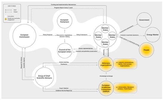Figure 4 illustrates the principal actors engaged in the ET according to EU guidelines, wherein core actors predominantly affiliated with EU organizations are distinguished by a white background. Additionally, the interactions between these actors are elaborately detailed, showcasing the inputs and outputs associated with each interaction. Notably, individuals and communities are highlighted in yellow to explicitly demonstrate their involvement at various policy formulation stages and clarify their roles. This figure constitutes an instrument for design research, providing researchers and designers with profound insights into the diverse landscape of actors participating in the ET. Its primary objective is to enrich research and design processes by facilitating the identification of key actors, their interactions, and their degrees of engagement. By offering a holistic view of the actors’ landscape, this visual representation enables the exploration of strategic partnerships and the establishment of effective communication channels to engage with diverse actors.