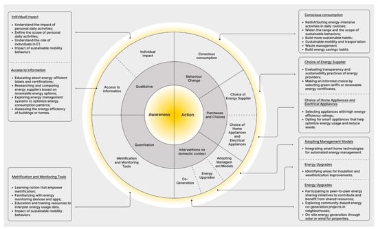 The first criterion (awareness) encompasses a qualitative understanding of one’s impact and energy information and a quantitative evaluation of energy usage in daily activities via metrification and monitoring tools. On the other hand, the second criterion (action) is based on the concept that individual actions can manifest via various dimensions, including changes in consumption behaviours, transitions towards more sustainable energy suppliers, the purchase of energy-efficient appliances, interventions in houses and domestic contexts such as smart energy management, and improvements in insulation and renewable energy generation.