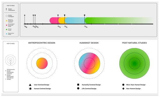In this section, a specific reference is made to anthropocentric, humanistic, and post-Humanistic design philosophies [] and design paradigms focusing on sustainability and ET (see Figure 6).