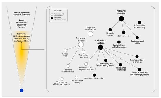 The literature identifies various barriers linked to the three dimensions: individual, local, and macro-systemic []. Specifically, at the individual level, forces such as attitudinal factors, personal needs, and capabilities come into play []. At the local level, habits and situational factors act as immediate and specific influences in a given moment and place, such as the surrounding physical environment, the presence of individuals, and perceptual stimuli []. Meanwhile, at the macro-systemic level, contextual forces operate, constituting a broader set of influences and conditions that extend beyond the immediate situation, such as social norms, governmental policies, and infrastructures.