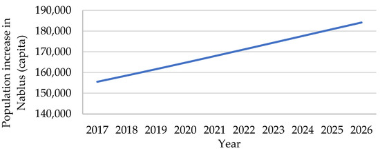 Nablus is a Palestinian city in the northern West Bank, approximately 49 km north of Jerusalem [20]. The population in Nablus city in 2023 is anticipated to be 174,387 as per data published in mid-2021 by the Palestinian Central Bureau of Statistics [21]. The estimated population increase over the years is presented in Figure 1. Nablus is the largest commercial and cultural center in the state of Palestine. The climate in the city is Mediterranean: hot dry in summer (temperature goes up to +30 °C) and cold and rainy in winter (with temperatures down to +3 °C) [22]. Nablus municipality has the largest solid waste management system in the state of Palestine. Part of its job is to collect the waste for the old city and the surrounding districts (within 70 km2). Meanwhile, the waste from the surrounding refugee camps is collected by the United Nations Relief and Works Agency (UNRWA). The waste is first delivered to a transfer station “Al-Sairafi Station”, located east and serving the city and the villages surrounding it. The final disposal site of the waste is Zahrat Al-finjan sanitary landfill in Jenin (27 km from Nablus).