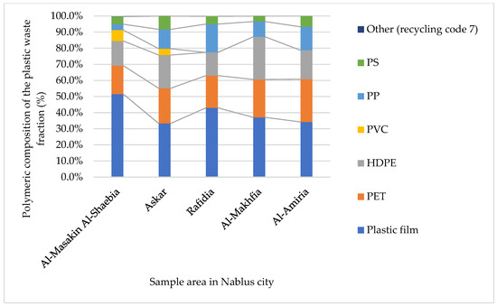 As indicated in Figure 3, the plastic fraction was the highest in Rafidia (12.1%) and the lowest in Al-Makhfia (8.2%), as a result of the lower commercial activities in Al-Makhfia. Furthermore, the polymeric composition of the plastic waste fraction varied from one district to another, as indicated in Figure 5.