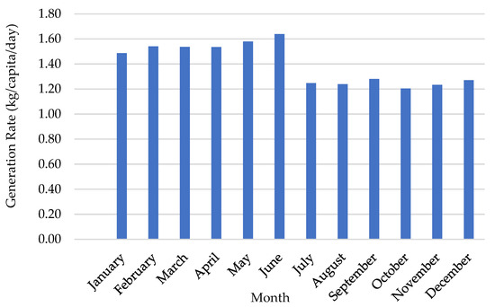 The average monthly waste generation in Nablus was calculated using data from 2016 to 2022 obtained from the Nablus municipality (see Figure 6). Usually, the MSW is measured by weighing waste collection vehicles at the entrance to sanitary landfills before and after unloading. Data indicate that the highest amount of waste generation was 1.64 kg/capita/day in July, while the lowest amount was recorded in October to be 1.20 kg/capita/day. The average rate of waste production in Nablus city was calculated to be 1.40 kg/capita/day. The amount of solid waste varies clearly from day to day and from one season to another in the same city; in addition it varies between countries, as well as between neighboring regions and between different neighborhoods in the same city [26].