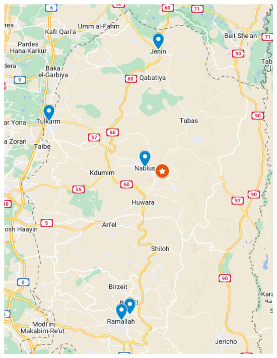 - Country Coordinate. GPS Coordinate of Nablus, Palestine: Retrieved on 21st of August 2023. 2023. Available online: https://www.countrycoordinate.com/city-nablus-palestine/ (accessed on 21 August 2023).