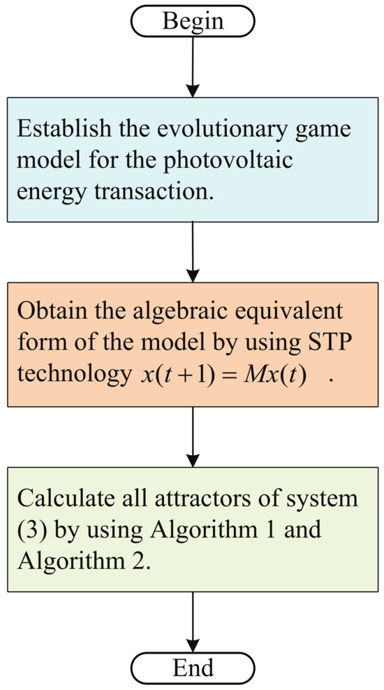 The rest of this paper is organized as follows. In Section 2, some preliminaries are introduced and the problem analysis of photovoltaic energy trading networks as well as some assumptions are given for the convenience of modeling. Then, the production and sales laws of photovoltaic power generation are analyzed, and the transaction process between PVPs and PVDs is modeled as a game in Section 3. This section also presents the main results. These results include the strategy-updating rule, payoff bimatrix, and two algorithms for calculating all attractors of the system to reveal the dynamic characteristics of the game model. An illustrative example is designed in Section 4. It shows that the strategies of all participants are constantly changing to achieve more profits, rather than stabilizing at the traditional Nash equilibrium point. Finally, a brief conclusion is provided in Section 5.