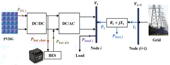 Generally, the optimal sizing and placement of PVDG in electrical distribution networks including ESSs are considered an optimization problem that should be solved in order to realize grid stability and power loss reduction. Nevertheless, to solve any optimization problem, an objective function is important to be used and formulated to reach the feasibility of solutions []. To do this, this section is devoted to developing a mathematical description for the problem of optimal sizing and placement of PVDG in presence of BES (PVDG-BES). To provide a better understanding, Figure 1 presents a simplified diagram of the studied PVDG-BES system connected to a distribution line connecting nodes i and i + 1.