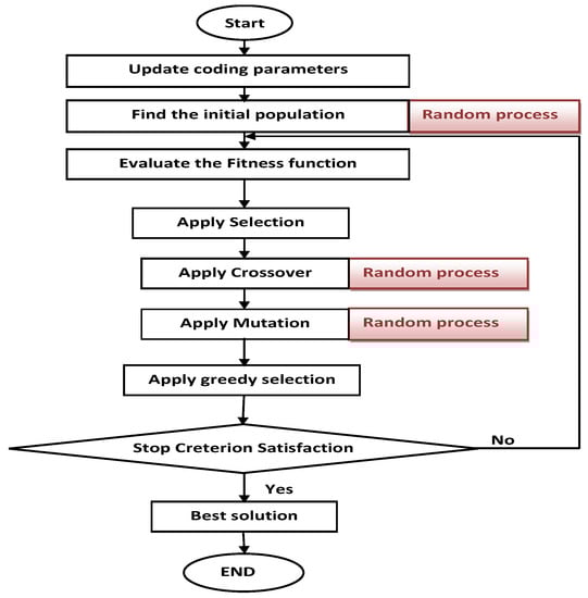 After that, the new solutions are randomly perturbed in the mutation phase according to a pre-specified mutation probability, . In the proposed technique, the non-uniform mutation is applied []. Therefore, each variable of the solution vector can be updated according to the following equation.