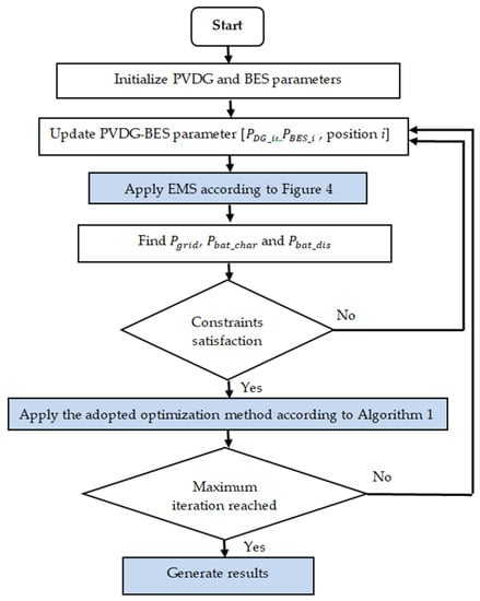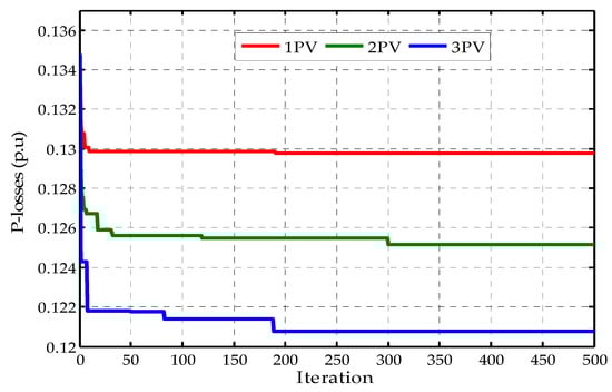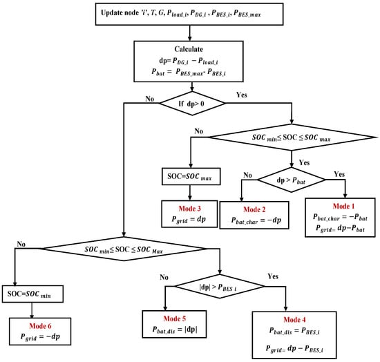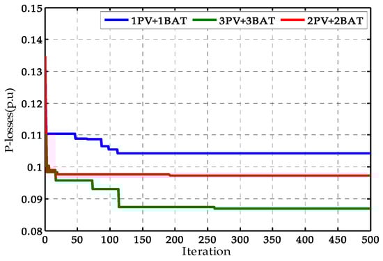 For more precision, PV and BES units are located at the same node to avoid power losses in case of the BES charge state []. The PVDG-BES optimal location and capacity will be determined, taking into account the total power losses in the system lines. Note that the best locations of PVDG-BES systems are selected from the set of load bus numbers. In fact, the integration of DG systems as close as possible to energy consumption will reduce energy distribution losses [].