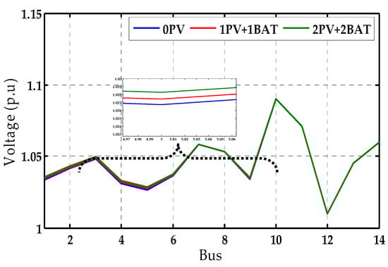 It is clear that integrating PVDG-BES system after applying the optimal EMS reduces grid power losses. In comparison with the case before integration of PVDG-BESs, the reduction percentage of losses when using only PVDG-BES units is about 10.86%, and it is about 20.14% when EMS is applied. In fact, optimal management of power flows between power grid components such as PVDG, BES and loads can reduce the intervention of the main grid, and consequently, it helps avoiding the reverse power flow, which is one of the main causes of grid power losses and safety problems. That proves the efficiency of power flow management strategy in power loss reduction and voltage profile improvement.