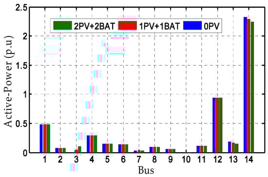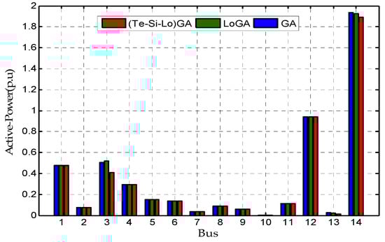 Figure 19 shows the active powers injected at the grid buses after integrating the optimal PV-BES system obtained using GA, LoGA and (Te-S-Lo)GA for Case 2. From this figure, it can be clearly seen that the active power injected at each system bus is affected by the integration of the PVDG-BES system. However, it is obvious that the values of these powers are more sensitive to the PVDG-BES system optimized using the hybrid (Te-Si-Lo)GA. For instance, the active power injected at bus 14 is reduced to 1.85 pu by using the LoGA; however, it is decreased to 1.8 pu when the (Te-Si-Lo)GA is used. Thus, the hybrid (Te-Si-Lo)GA based PVDG-BES system presents better performance compared with the other techniques in terms of injected active power reduction.