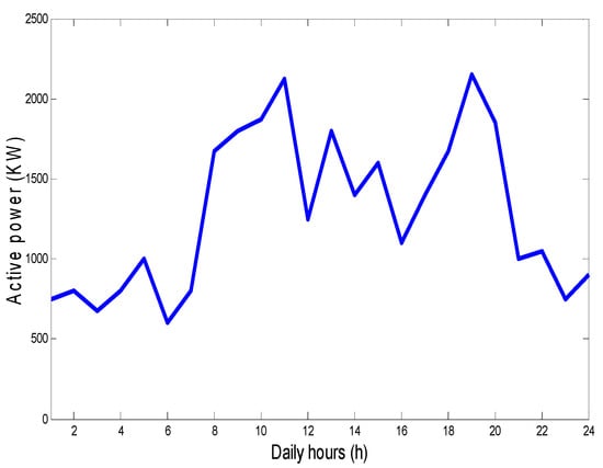 In this case, the power consumed by each load follows a specific consumption profile that is given in Figure 15 []. The main objective of this subsection is to study and analyze the effects of taking into account the variability of the atmospheric conditions and load consumption profile on the optimal placement and sizing of PVDG-BES systems. To do this, the proposed strategy described in Figure 6 is employed to obtain the optimal size and position of the aforementioned system in such a way that the load demand is covered at each hour. The optimal power flow management strategy presented in Figure 5 is used to correctly manage the power transferred between all system components.