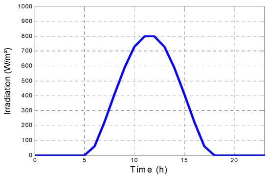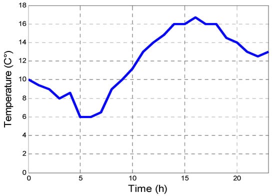 The load consumption profile, temperature (T) and irradiation (G) variations during 24H are presented in Figure 15, Figure 16 and Figure 17, respectively. It is noteworthy that the output power of the PVDG system depends on T and G, and it can be calculated according to Equations (1)–(3).