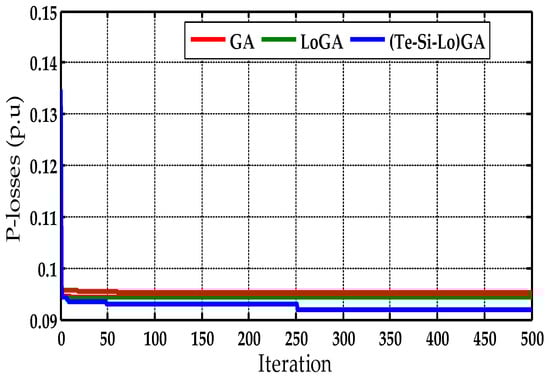 According to Figure 19, the GA-, LoGA- and (Te-Si-Lo)GA-based optimization methods reached the optimal solutions after 479, 377 and 252 iterations, respectively. The total real power loss is 0.0953 pu for GA, 0.0943 pu for LoGA and 0.0919 pu for (Te-Si-Lo)GA. In conclusion, the hybrid (Te-Si-Lo)GA presents better performance than the two other optimization algorithms in terms of speed convergence and global minimum power losses tracking. These results validate the experimental results performed on the studied benchmark function.