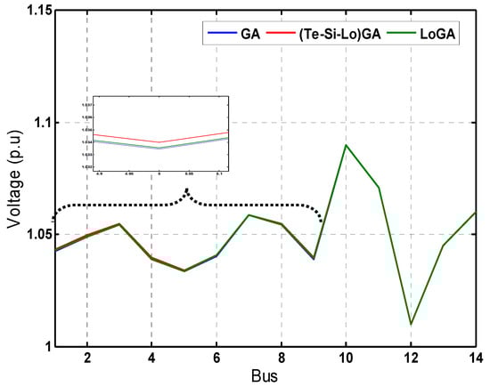 System voltage profile using GA, LoGA and hybrid (Te-Si-Lo)GA for Case 2.