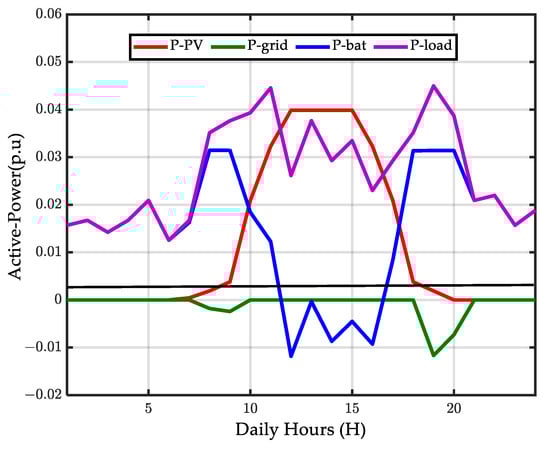 Besides, from 7 a.m. to midday and from 5 p.m. to 8 p.m., the PVDG system generates power (). However, this production is insufficient to cover the load demand (), therefore, BES unit intervenes to compensate this lack of power () to the loads. As results, the point of consumption where the PVDG-BES is integrated receives power from the PVDG system and BES unit instead of taking it from the grid. Nevertheless, when the PVDG-BES system cannot satisfy all load needs, the grid intervenes to provide power, especially from 6 p.m. to 9 p.m. After that period, only the BES unit continues to produce the required power until 7 a.m. At midday, the power output of the PVDG system becomes greater than the load demand (), and this situation continues until 5 p.m. Therefore, the PVDG system is the only producer of the energy in that time period, and the excess of power will be absorbed by the battery () instead of being injected into the grid.