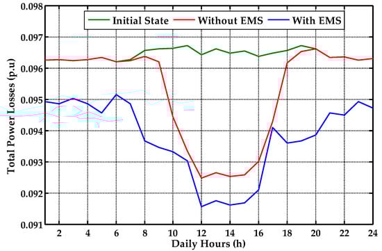 Figure 22 presents the total power loss during 24 h both before adding the PVDG-BES systems (initial state) and then after integrating the DG system coupled with the energy storage system with and without using the EMS. It can be noted that the aim of this step is to analyze the effect of using the EMS on grid power loss.