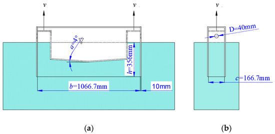 Considering that the spacing of the ship chamber along the longitudinal beam is unchanged, a cavity enclosed by the main longitudinal beam of the ship chamber and the adjacent beams can be used for water exit behavior investigation. A schematic of the experiments is shown in Figure 1. The shape parameters of the cavity were selected by referring to those of the Jinghong ship lift [4,5,6] and Yantan ship lift [8] in China. If the design tested is considered to be a scale model, the scale is 1:15 and the model and prototype cavities are related by Froudian similitude. The lift of the cavity was driven by a steeper motor. Using the motor, the cavity can be raised at a constant speed v. The side wall of the cavity was equipped with a circle air entrance with a diameter of D, through which the air can flow into the cavity during the water exit process.