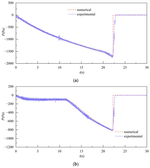 The maximum negative pressure during the water exit process was further analyzed using the proposed numerical model in Section 2.2. Based on the experimental results, two main dimensionless parameters governing the water exit process were selected and combined to investigate the maximum negative pressure characteristics: relative lifting velocity v/(gh)0.5 and relative ported area Ae/Ac. The details of the numerical simulations are presented in Figure 4.