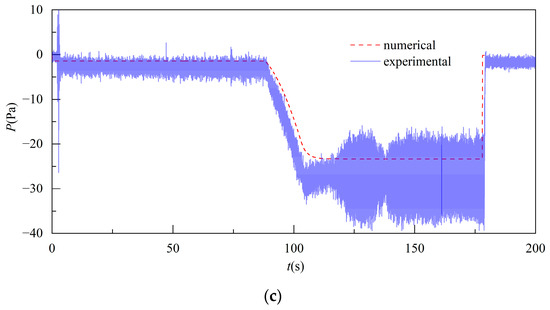 Comparison between numerical and experimental air pressure profiles: (a) D = 2 mm and v = 16 mm/s; (b) D = 7 mm and v = 16 mm/s; (c) D = 7 mm and v = 2 mm/s.