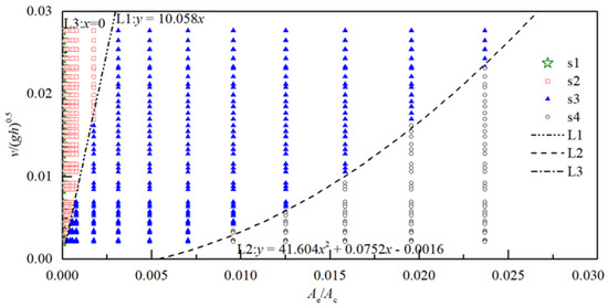 The numerical results indicated that four zones can be identified in Figure 4; namely, S1, S2, S3, and S4. The S1 zone was characterized by Ae/Ac = 0. In this zone, the maximum negative pressure was solely dependent on the initial submerged water depth, and can be described by the following equation (r2 = 0.99):