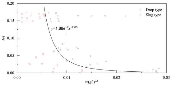 The experimental results indicate that the flow type inside the cavity at water exit was strongly dependent on the relative lifting velocity v/(gh)0.5 and relative characteristic length l/h, with l as the length of air entrainment. In Figure 8, the flow types were related to l/h as a function of v/(gh)0.5. It is evident that a limit line split the plane (v/(gh)0.5, l/h) into a “slug zone” and a “drop zone”, which can be expressed as