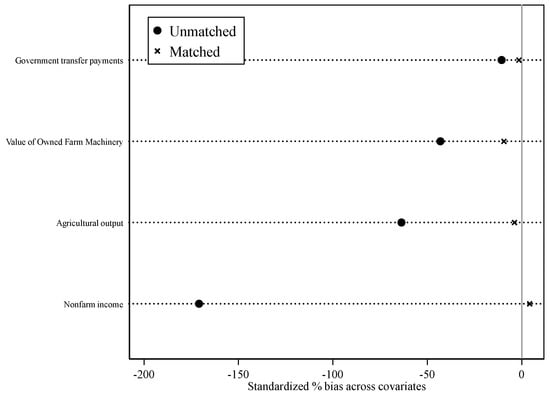 The principle is to use the propensity score as a distance function for matching. The propensity score is calculated as the conditional probability that farmer enters into the treatment group given the covariate of farmer . Thus, propensity score matching is a method of matching based on the similarity of conditional probabilities, i.e., . There are also more methods for propensity score matching, and the most popular nearest neighbor matching is used in this paper. When matching, individual observations are allowed to be used as matching more than once. Specifically, for each farmer, four closest farmer matches are found, i.e., one-to-four matching. According to Abadie et al. (2004) [], one-to-four matching can minimize the mean square error, which can use as much sample information as possible while minimizing the matching bias.