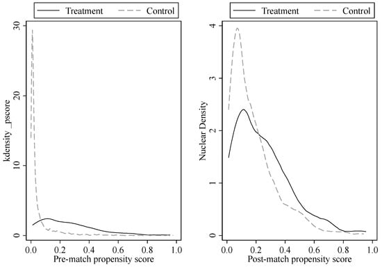 In this paper, the propensity score matching difference-in-difference (PSM-DID) model is used for effect estimation. The reasons are: firstly, there may be missing not at random in the sample during the survey, and the propensity score matching method is used to obtain an appropriate counterfactual sample by matching the treatment and control groups to alleviate the problem of sample self-selection bias. Secondly, the interference of omitted variables of time-invariant is eliminated by using the difference-in-difference method []. The specific setting form of the PSM-DID model is referred to in the study of Heckman et al. (1997) []. The DID model is widely used to evaluate the effectiveness of policy implementation []. To a certain extent, the model controls for influences other than policy interventions. At the same time, the inclusion of other control variables in the model further controls for some of the “noise” in the treatment and control groups, compensating for the shortcomings of quasi-natural experiments in which the sample assignment is not completely randomized, thus allowing for a true assessment of policy effects [].