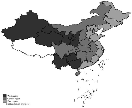 Due to the imbalances in China’s economic development [,], there will also be differences in the response of the east, central, and west regions to the policy. We also focus on regional heterogeneity when studying policy effects, and the article also proposes Corollary 2.