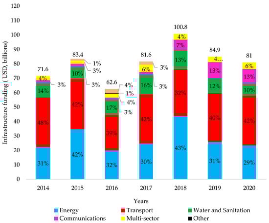 Fay et al. [11] estimates that in 2007, Africa’s investment on infrastructure development projects was about 1.5% of its regional gross domestic product (G.D.P.), and in 2014 the estimated investment on infrastructure development in sub-Saharan Africa (S.S.A.) is estimated to be 1.9% of its G.D.P. According to [14], the annual investment on infrastructure development in Africa was approximately USD 72 billion in 2014, USD 83 billion in 2015, USD 63 billion in 2016, USD 82 billion in 2017, USD 101 billion in 2018, USD 85 billion in 2019 and USD 81 billion in 2020. Figure 1 below gives details on the infrastructure investment share between energy, transport, water and sanitation, communication and other infrastructure projects in the continent. Although the figures show a decline in infrastructure development in 2019 and 2020, the 2021 Global Status Report for Buildings and Construction points out that as the construction industry gains momentum after the COVID 19 pandemic brought it to a near halt in 2019, construction activities in developing countries (all African countries included) are expected to double as they correspond to growing needs for infrastructure systems [17,18].