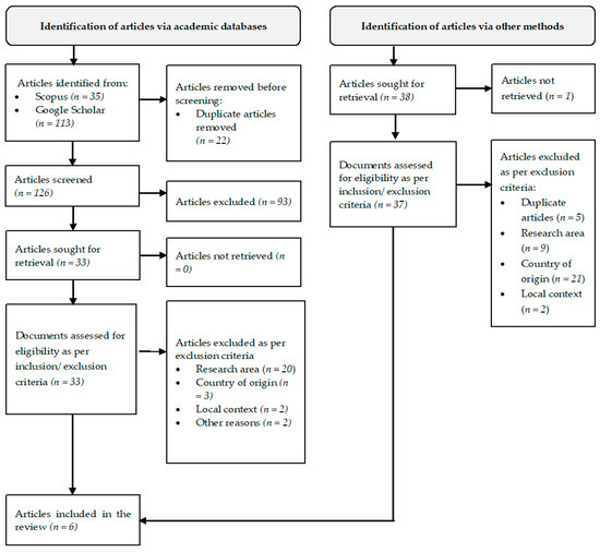 In addition to the searches on Scopus and Google Scholar, the reference lists of similar reviews were also screened to identify potential primary sources. A total of thirty-eight documents were identified from this screening. The PRISMA 2020 flow diagram for systematic reviews [65] directs that the title and the abstract screen should be done after duplicate documents are removed from search results. But in this review, the titles and abstracts were screened before the document results from Scopus and Google Scholar were combined and screened for duplicate records. The reason for doing this was to identify studies that were specific to the African continent. The search chain used on both Scopus and Google Scholar included the terms, “DEVELOPING COUNTRIES” or “DEVELOPING COUNTRY”. Therefore, the results on both databases included studies that focused on other developing countries outside of Africa.