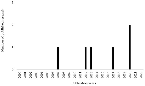 Like [61], a bar chart (Figure 3) is also used to report the results on yearly research publications. The bar chart shows the number of published studies against the study duration of this review (2000 to 2022). According to the results, there has been a consistent publication of one sustainability assessment process in 2007, 2012, 2013 and 2017. In 2020 two studies that created sustainability assessment processes for infrastructure in Africa were published.