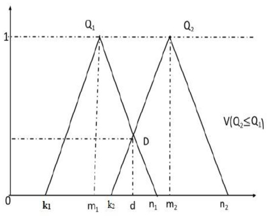 The intersection of two TFNs, i.e., and , is shown in Figure 4. The intersection is shown as ordinate d, representing the highest possible fuzzy numbers intersection and . Furthermore, and, may be determined using the values of V ( ≥ ) and V ( ≥ ).
