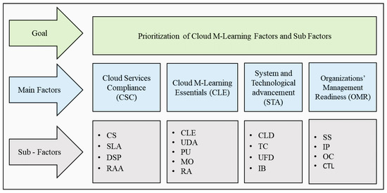 The factors that must be measured in each stage of planning, development, and operation are known as CSFs [17]. They can assist in discovering, regulating, and monitoring the success of a high-quality cloud-based M-Learning system. CSFs play a significant role in CBLL as they directly or indirectly influence the success of CBLM. While carrying out the literature review, it is observed that several studies determined lead identification of CSFs of CBML. Based on such studies, various CSFs, suggested by several researchers, were critically examined—as it is difficult to model CSFs to identify their importance in the success of CBLM. To ensure all the significant CSFs were covered in the present study, the systematic framework leading to the whole process was derived. Figure 2 shows the CSF selection framework for CBML. Using the expert knowledge of decision-makers (DMs), 21 CSFs were shortlisted. DMs were quite careful while choosing CSFs from the identified CSFs of 25. For several reasons (for instance, redundancy, not applicable to CBML, etc.), four CSFs were dropped. Thus, DMs ensured the influence of the selected CSFs of CBML that were potentially responsible for CBML’s involvement in the teaching–learning system. As per the feedback from DMs, 17 CSFs were shortlisted and grouped into four main CSFs, i.e., Cloud Services Compliance (CSC), Cloud M-Learning Essentials (CLE), System and Technological Advancement (STA), and Organizations’ Management Readiness (OMR). Later on, AHP-GDM and FAHP-based modeling were carried out following the framework. The various main factors and subfactors of CBML chosen are discussed below: