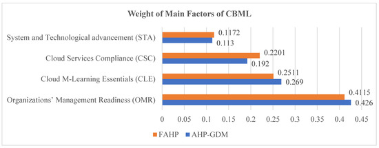 Apart from M-Learning, CBML also plays a vital role in the teaching–learning system. Smartphones with greater capabilities have made it possible to break the barriers of constrained classroom teaching. The internet revolution has increased the dissemination of knowledge through cloud-based mobile learning. Based on AHP-GDM and FAHP modeling, the weights of various main factors and subfactors of CBML were obtained. The weights obtained for the main CSFs of CBML through AHP-GDM and FAHP modeling were: OMR , whereas for FAHP, the weights obtained were: OMR STA, where indicates the preference over other as shown in Figure 8.